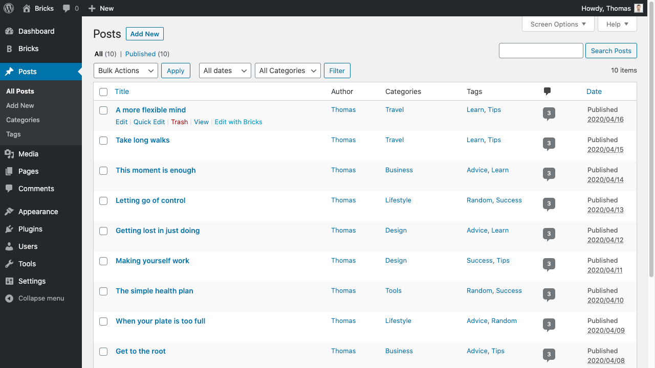 To enter the builder, click the Edit with Bricks link when hovering over the post title in your WordPress dashboard: