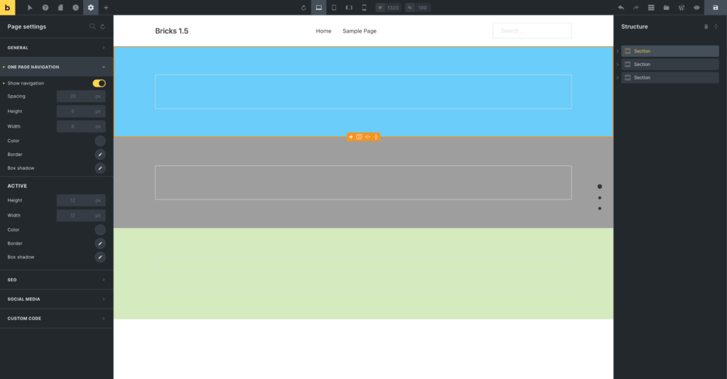 Section titled “One Page Navigation”If enabled, Bricks adds a vertical dot menu to the right edge of the page in a fixed position, with each dot linking to the page’s root element.