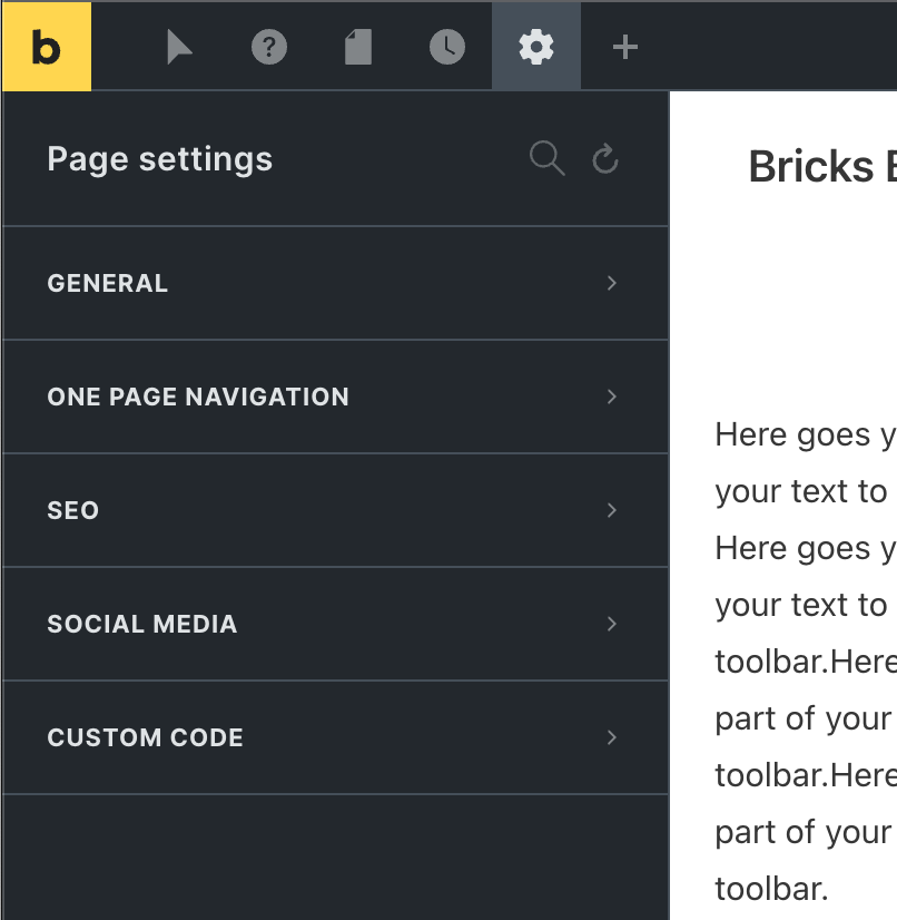 Page Settings allow you to customize the markup and styling of the page you are currently editing. They are located within the Settings panel (gear icon in the builder toolbar).