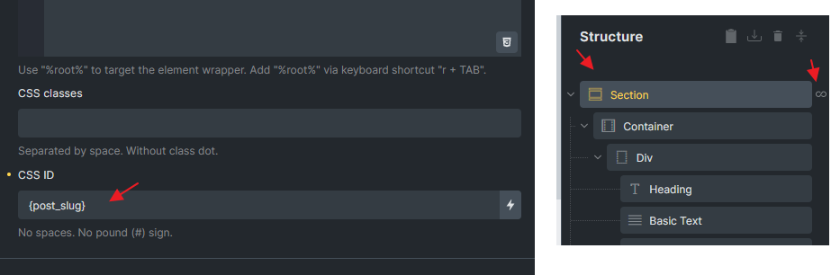 Note: A unique CSS ID is required for root elements (sections, etc.) for One Page Navigation to work. If the root element is within a query loop, you can assign a CSS ID using dynamic tags like post_id or post_slug. (assumed it’s a post loop)