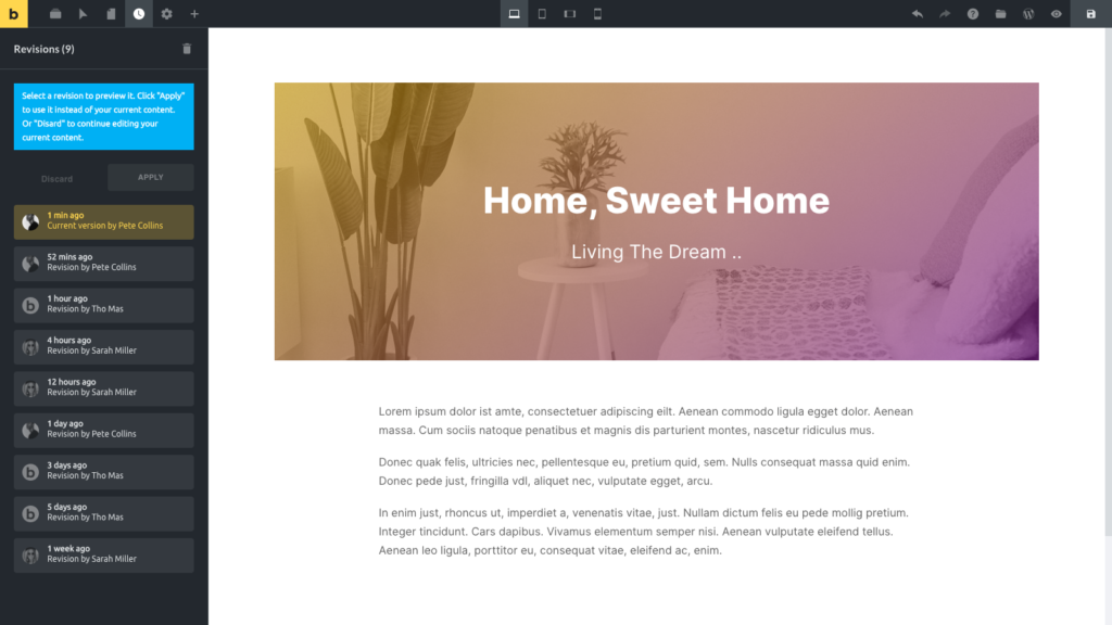 You can browse, preview, and apply your revisions inside the builder by clicking the Revisions (clock) icon in the builder toolbar, then going to the “Revisions” tab.
