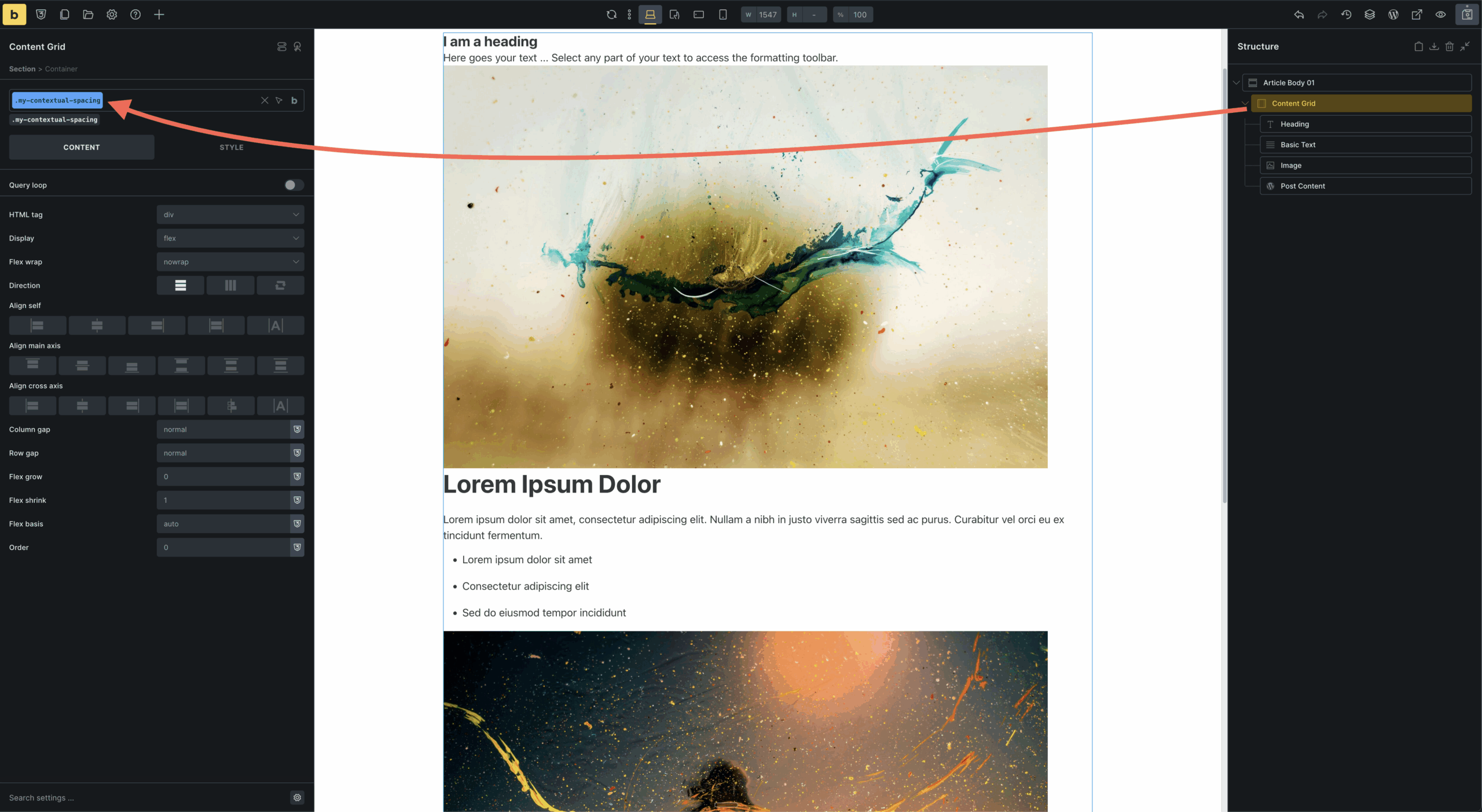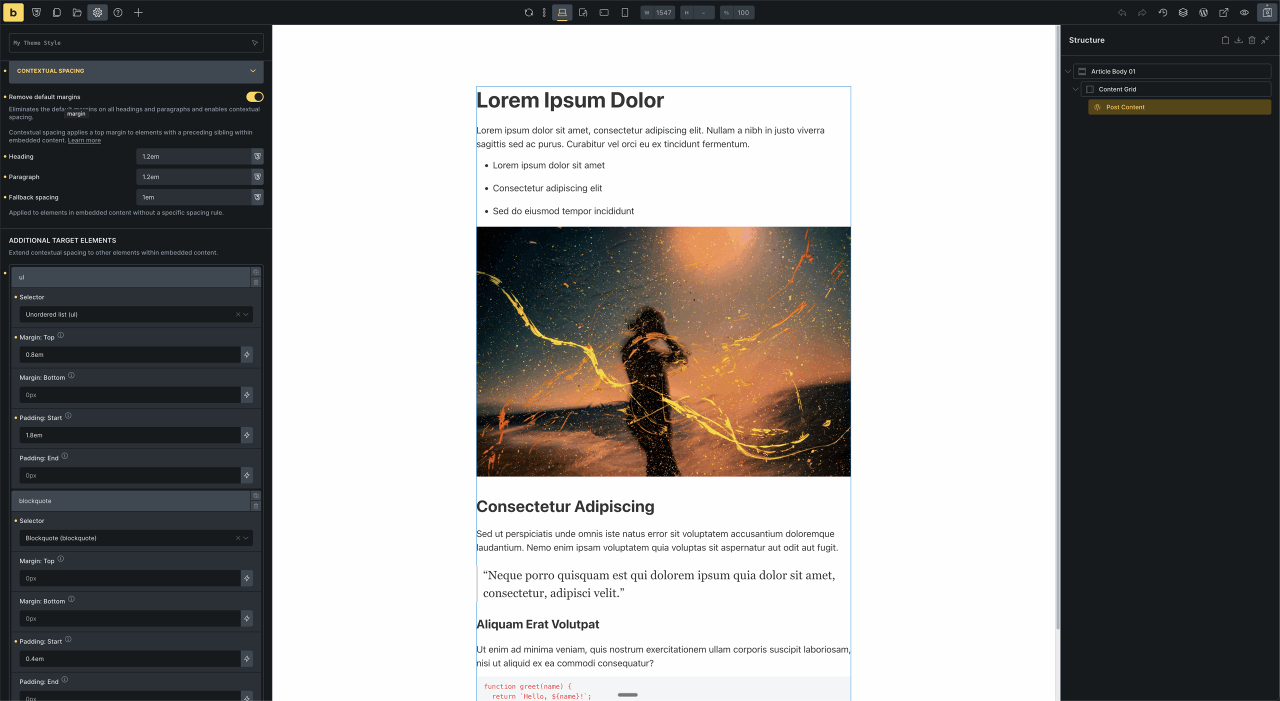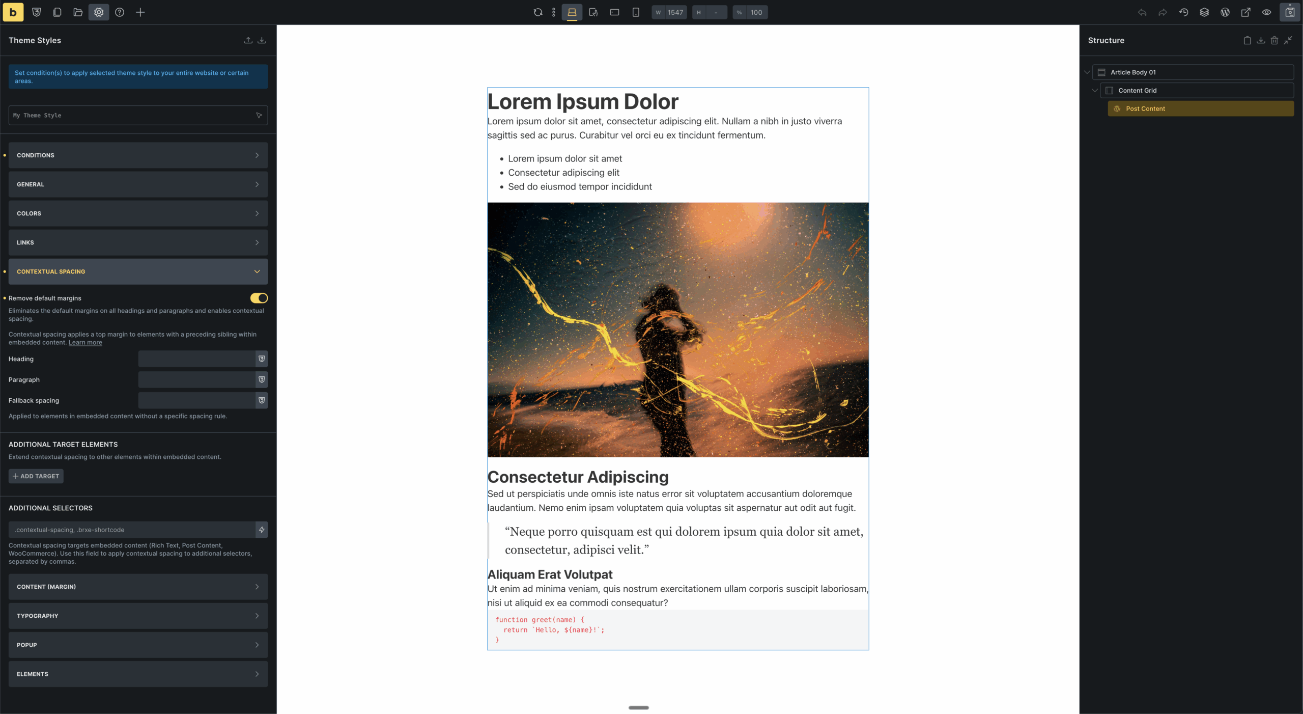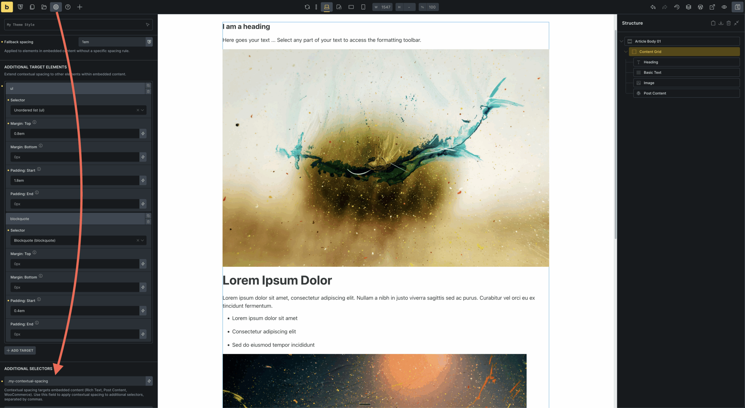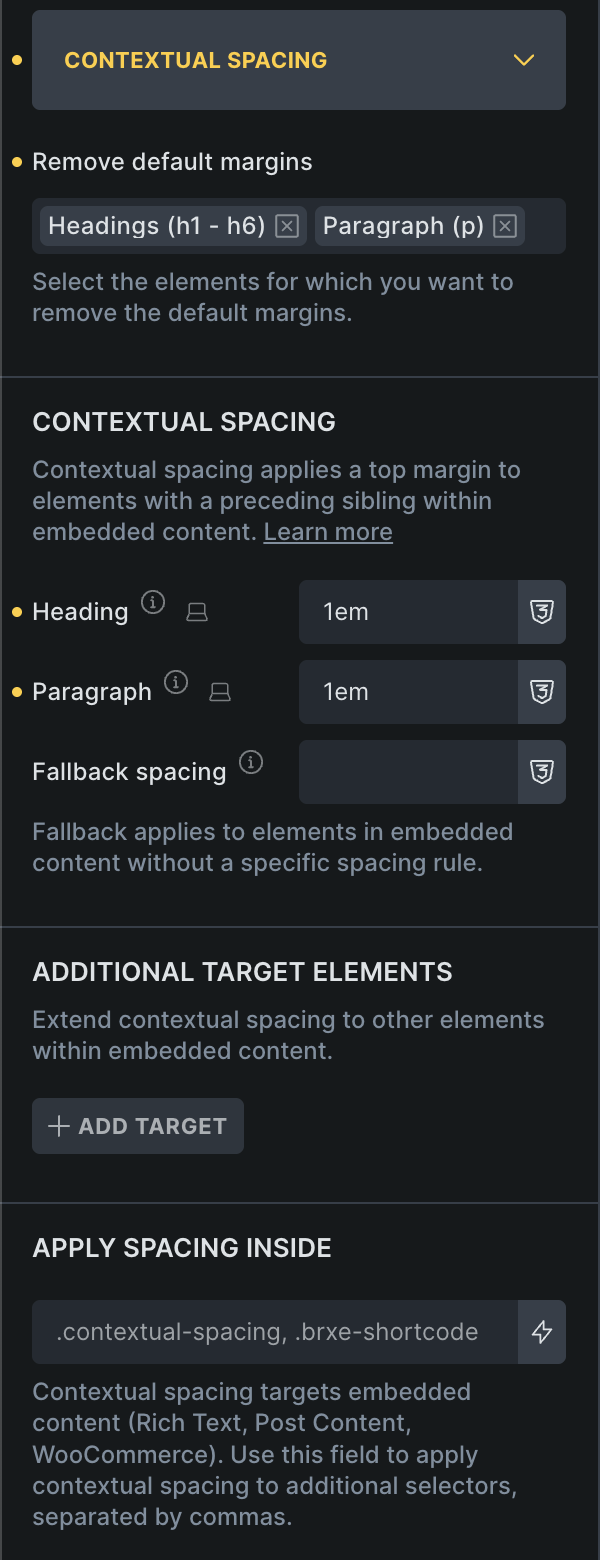 Section titled “Apply to more content areas”By default, Contextual spacing only targets Rich Text, Post Content, and WooCommerce content. But you can easily extend it by defining Additional selectors to apply Contextual spacing to any wrapper of your choice, such as .contextual-spacing, .brxe-shortcode.