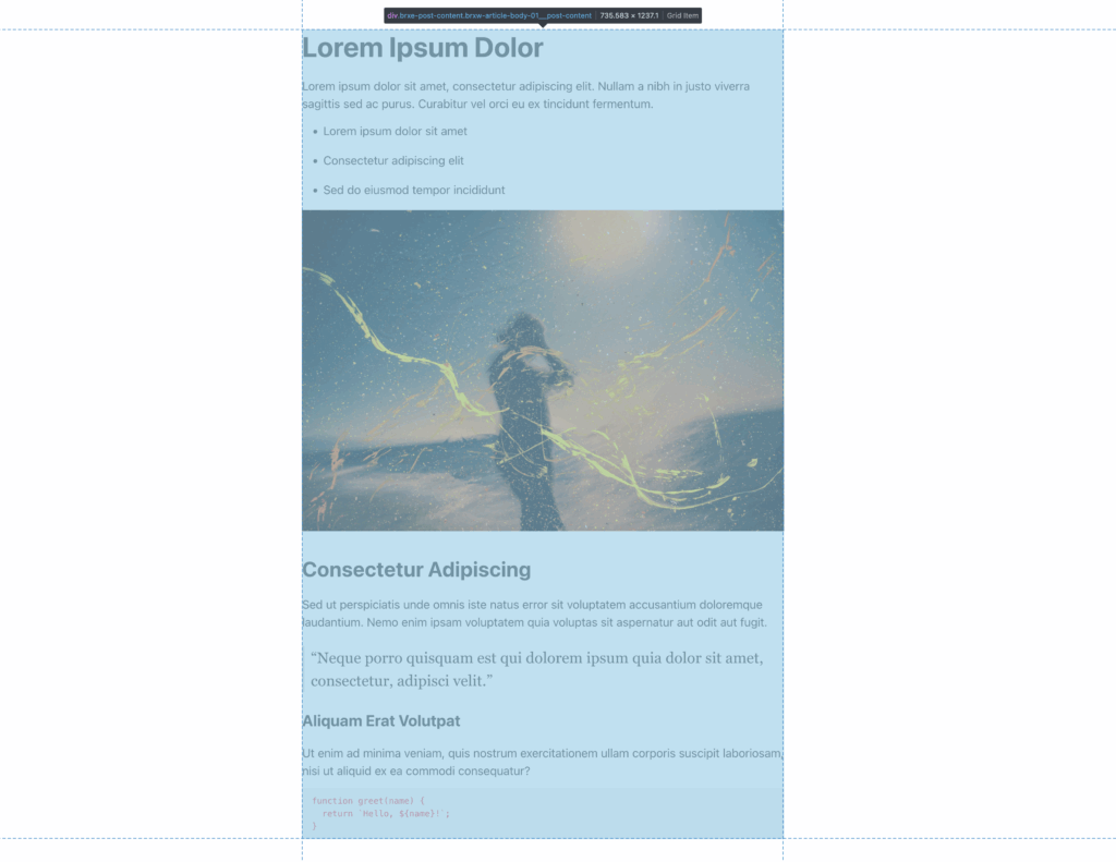 Bricks then applies spacing only between elements where needed. The first element inside the post has no margin above it, but elements that follow each other are spaced consistently.
