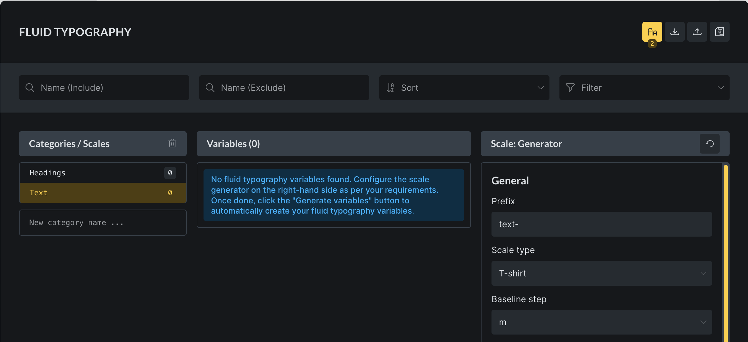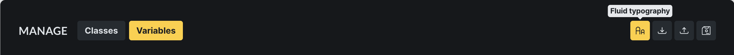 Section titled “Accessing fluid typography”To access the Fluid Typography Generator click the Aa icon in the header of the Variable Manager: