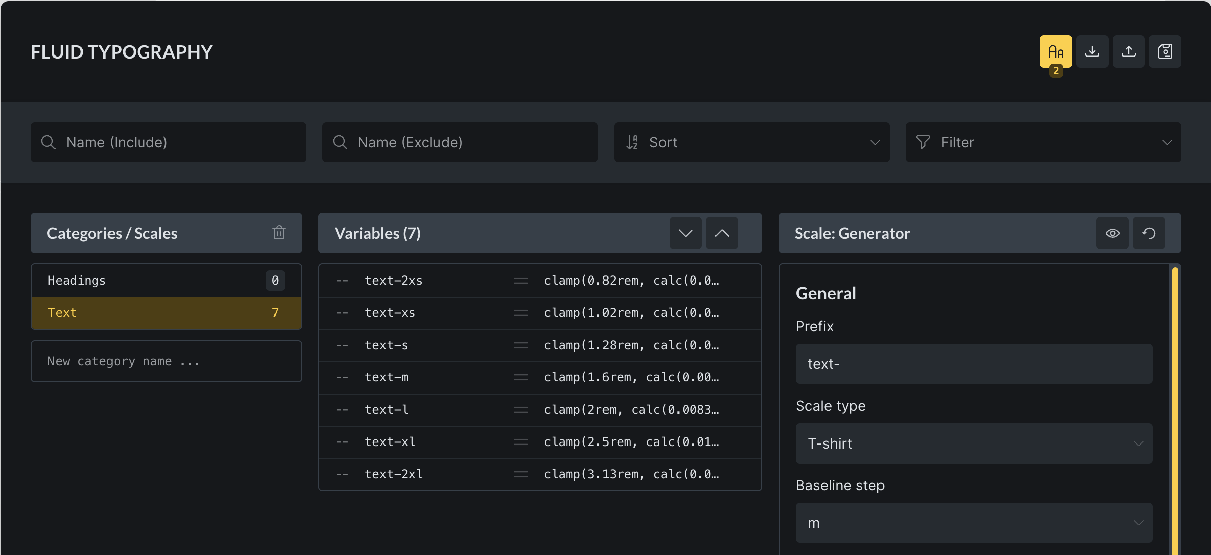 So, every Category is a Fluid Typography Scale, that stores all its scale settings alongside it.