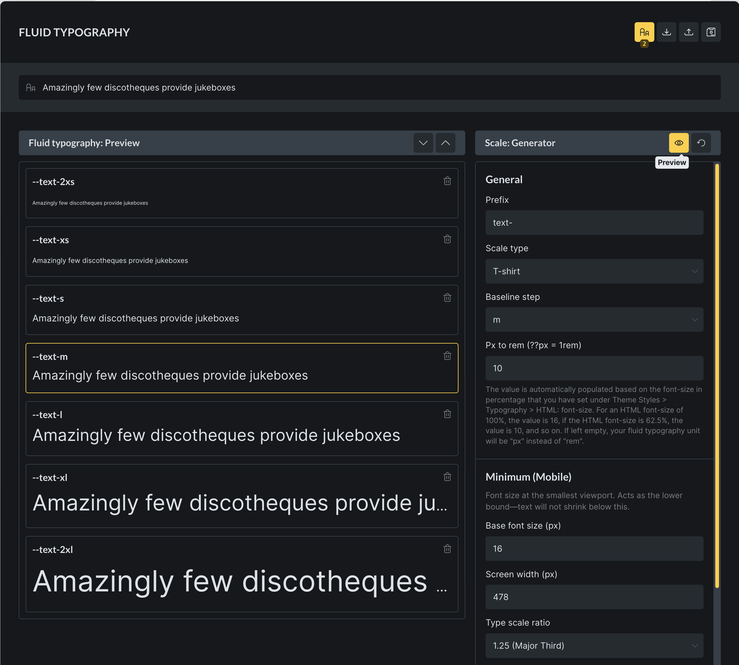 Section titled “Typography preview”A preview of the fluid typography can be activated by selecting the eye icon in the Scale Generator. Which opens the preview window on the left side of the popup, while hiding the categories to maximise space.
