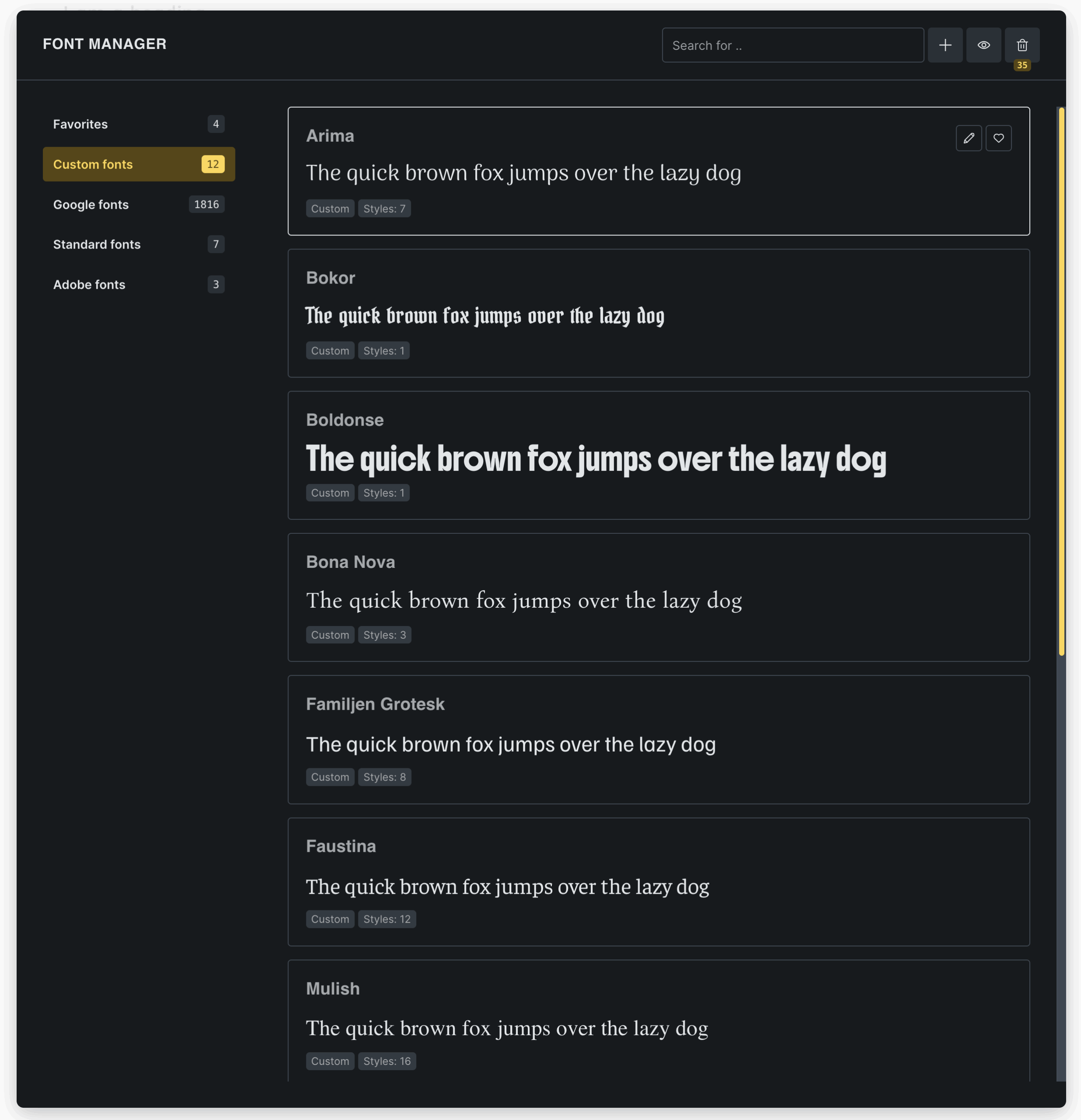 This opens a popup where you can manage all available fonts (Google fonts, Adobe fonts, Standard fonts, and Custom fonts).