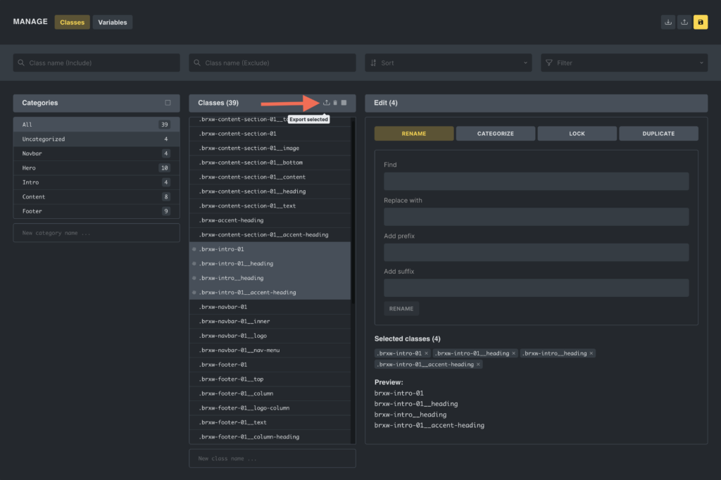 Section titled “Exporting and importing classes”The Global Class Manager facilitates the exporting and importing of CSS classes, making it easier to maintain a consistent styling framework across various Bricks projects.
