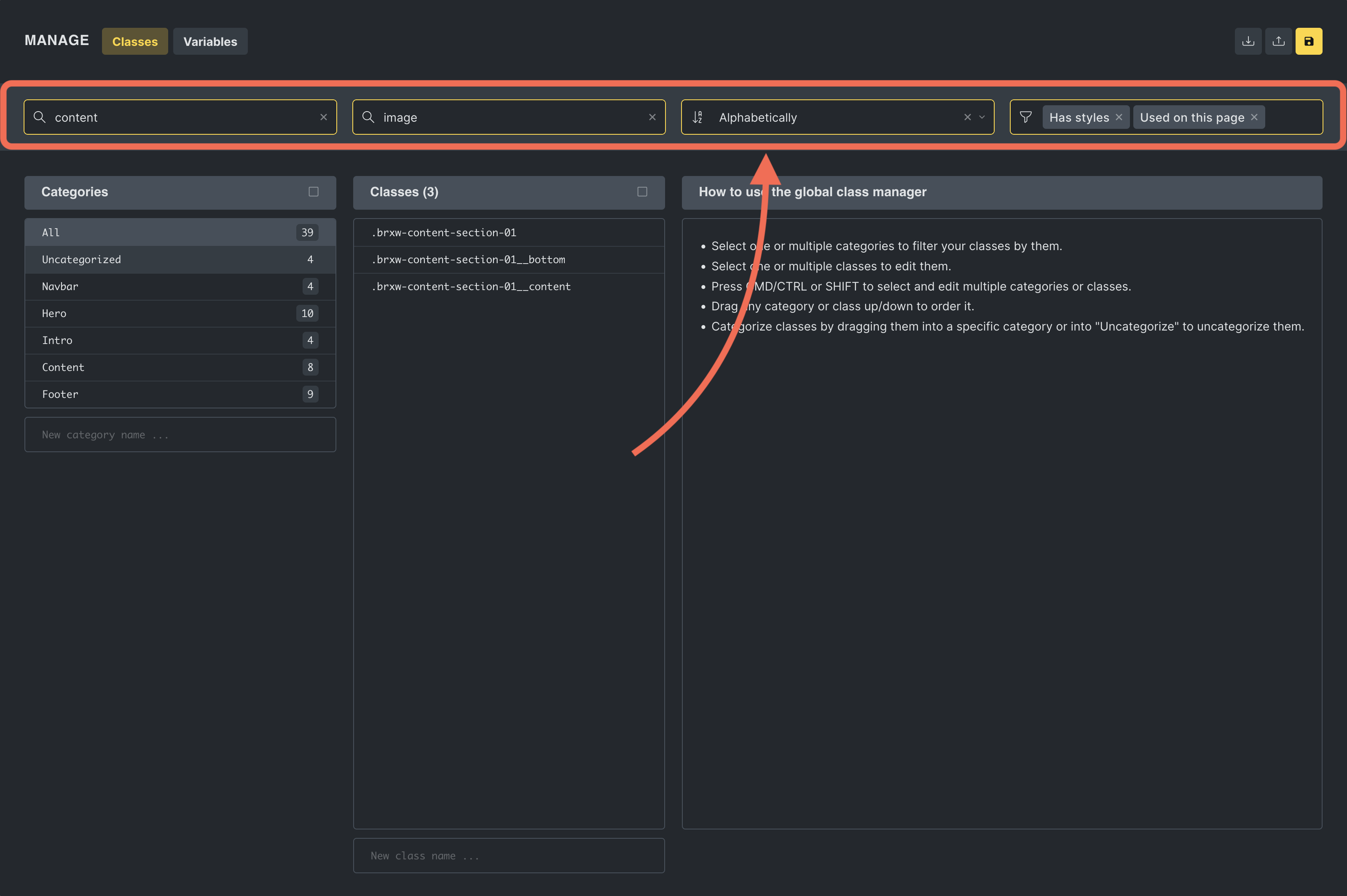 Section titled “Class creation and management”In the Global Class Manager, you can seamlessly handle your CSS classes through a unified interface where they can: