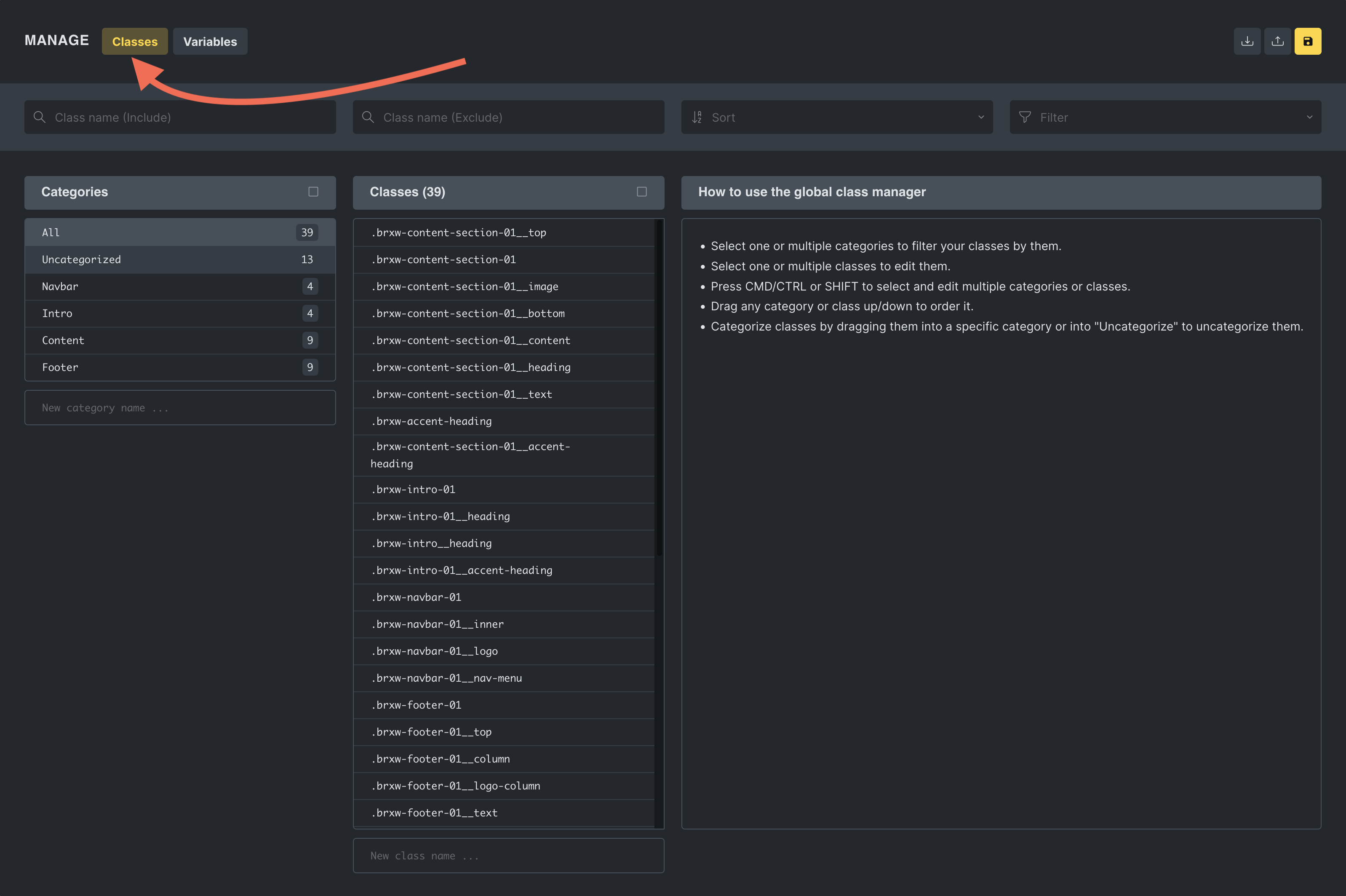 This action launches a popup where you can switch between managing your global classes and global CSS variables. Select “Classes” to open the class manager interface (if not already selected).