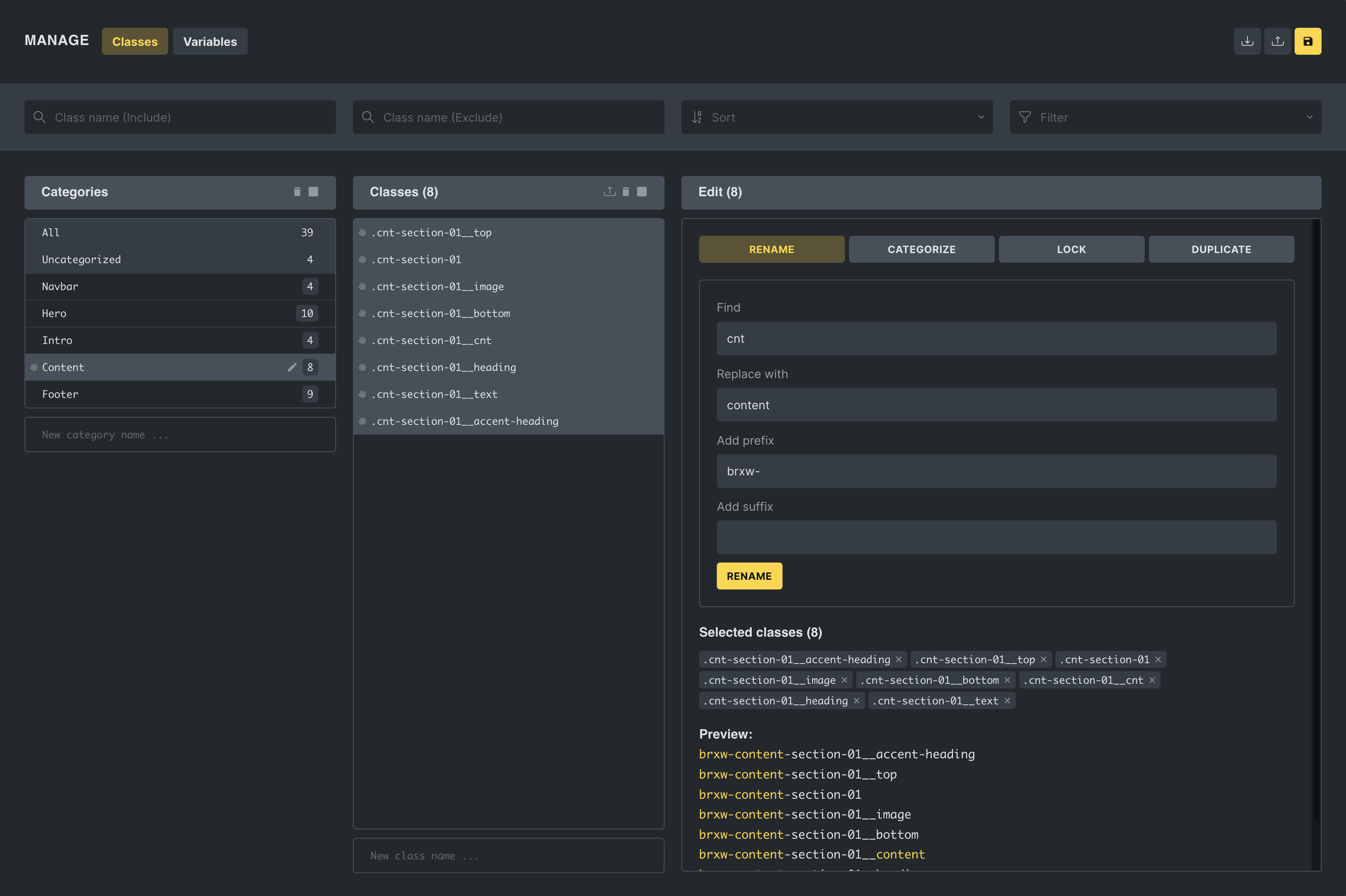 Bulk actions: When two or more classes are selected, the editor enables users to perform mass actions such as renaming, duplicating, locking, and unlocking classes. These actions include the ability to find and replace strings or add prefixes or suffixes to class names.