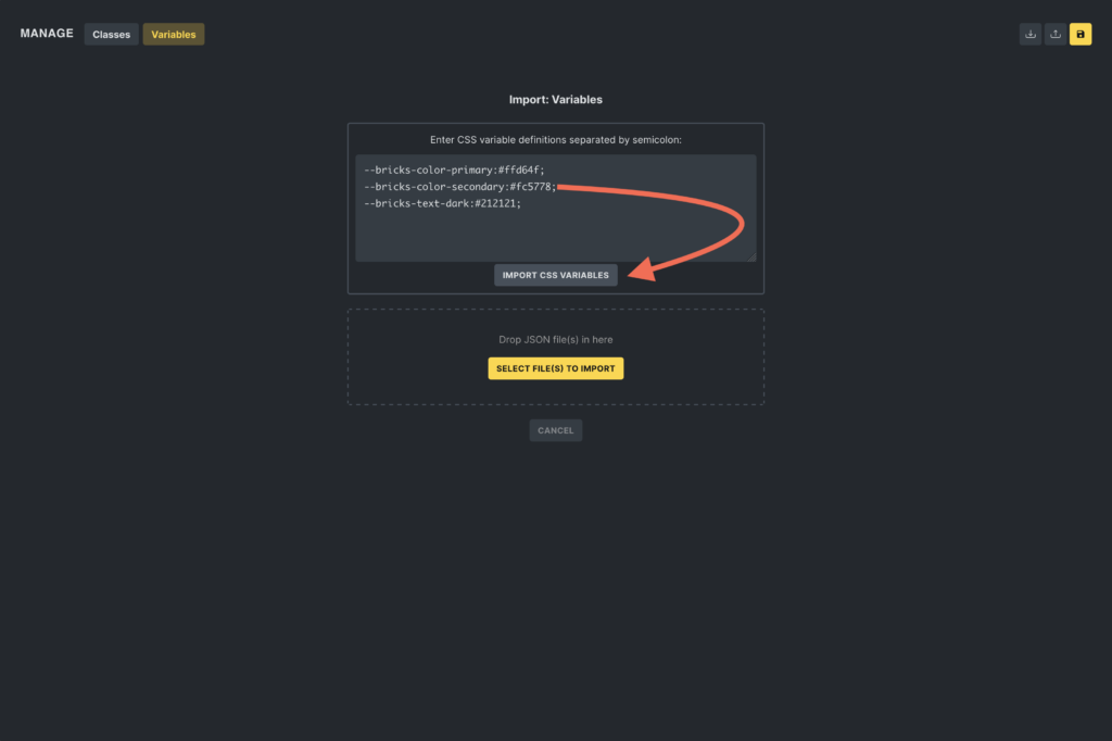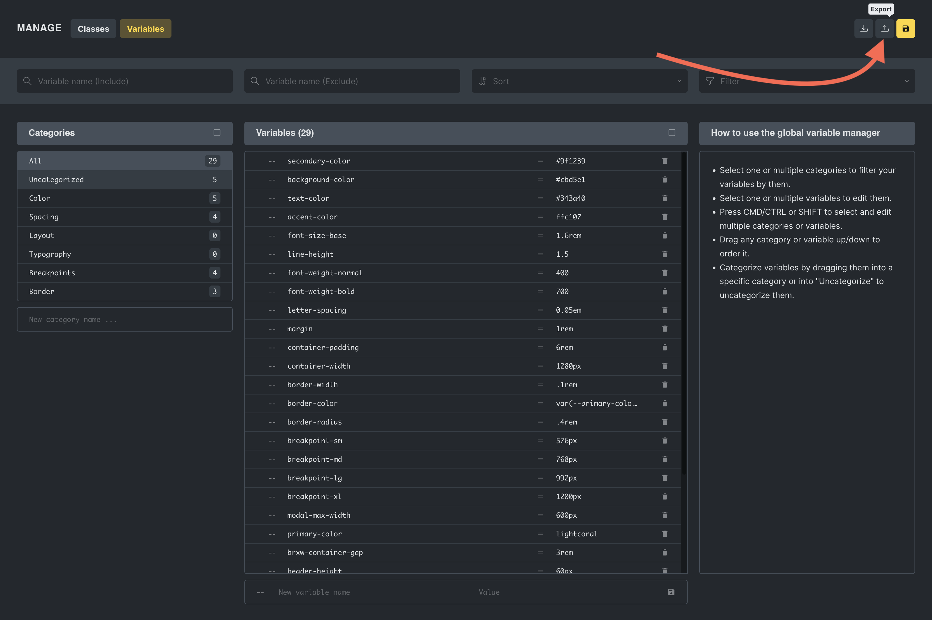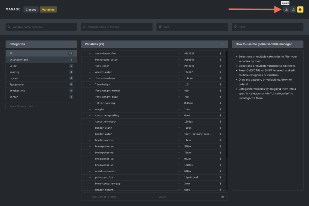 Section titled “Exporting and importing variables”The Global Variables Manager facilitates the exporting and importing of CSS variables, making it easier to maintain a consistent styling framework across various Bricks projects.