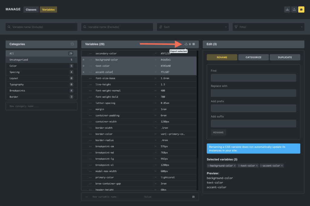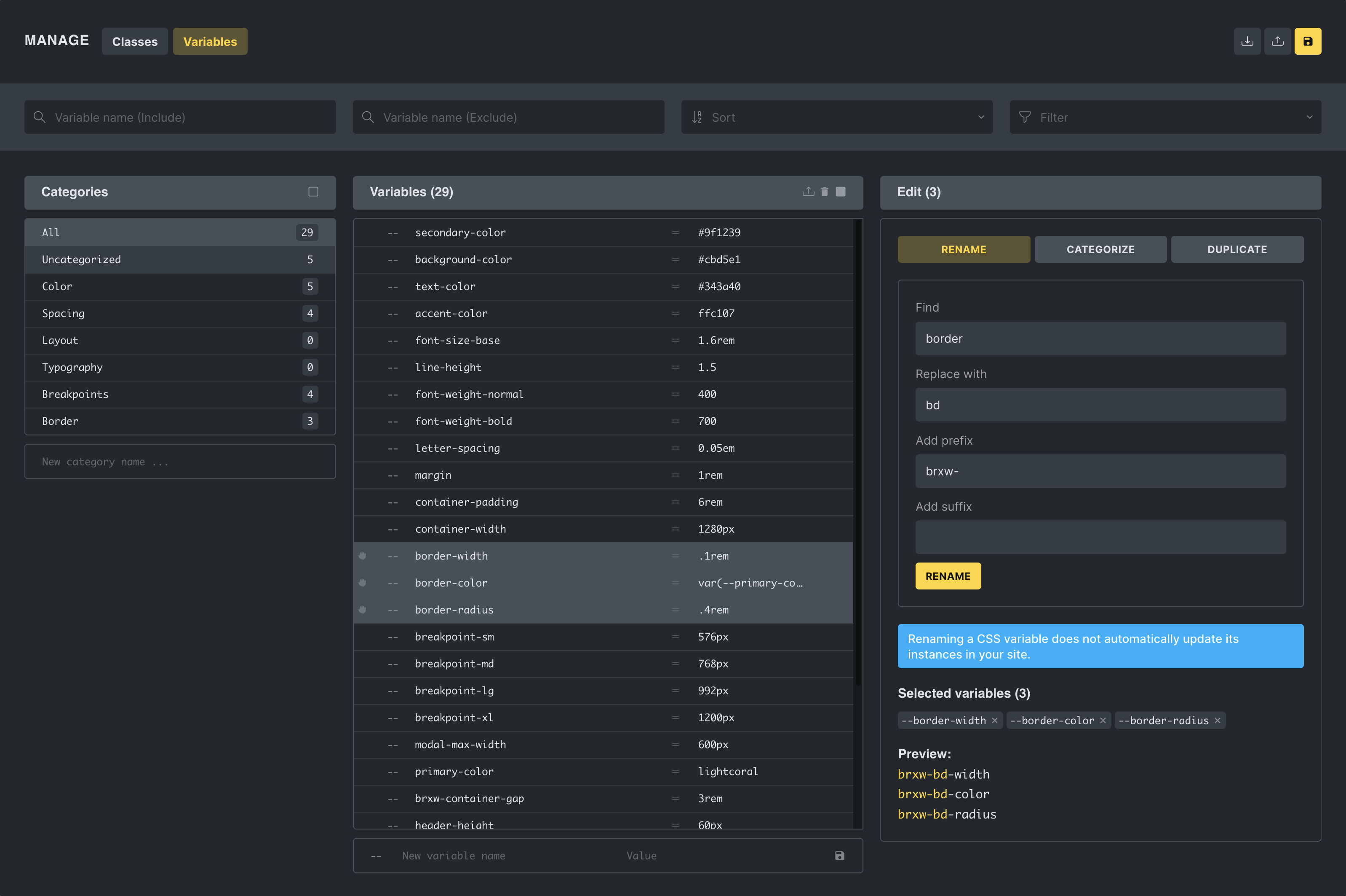 Bulk actions: When two or more variables are selected, the editor enables you to perform bulk actions such as renaming and duplicating. These actions include the ability to find and replace strings or add prefixes or suffixes to variable names. However, it’s important to note that renaming a CSS variable does not automatically update its instances throughout your site.