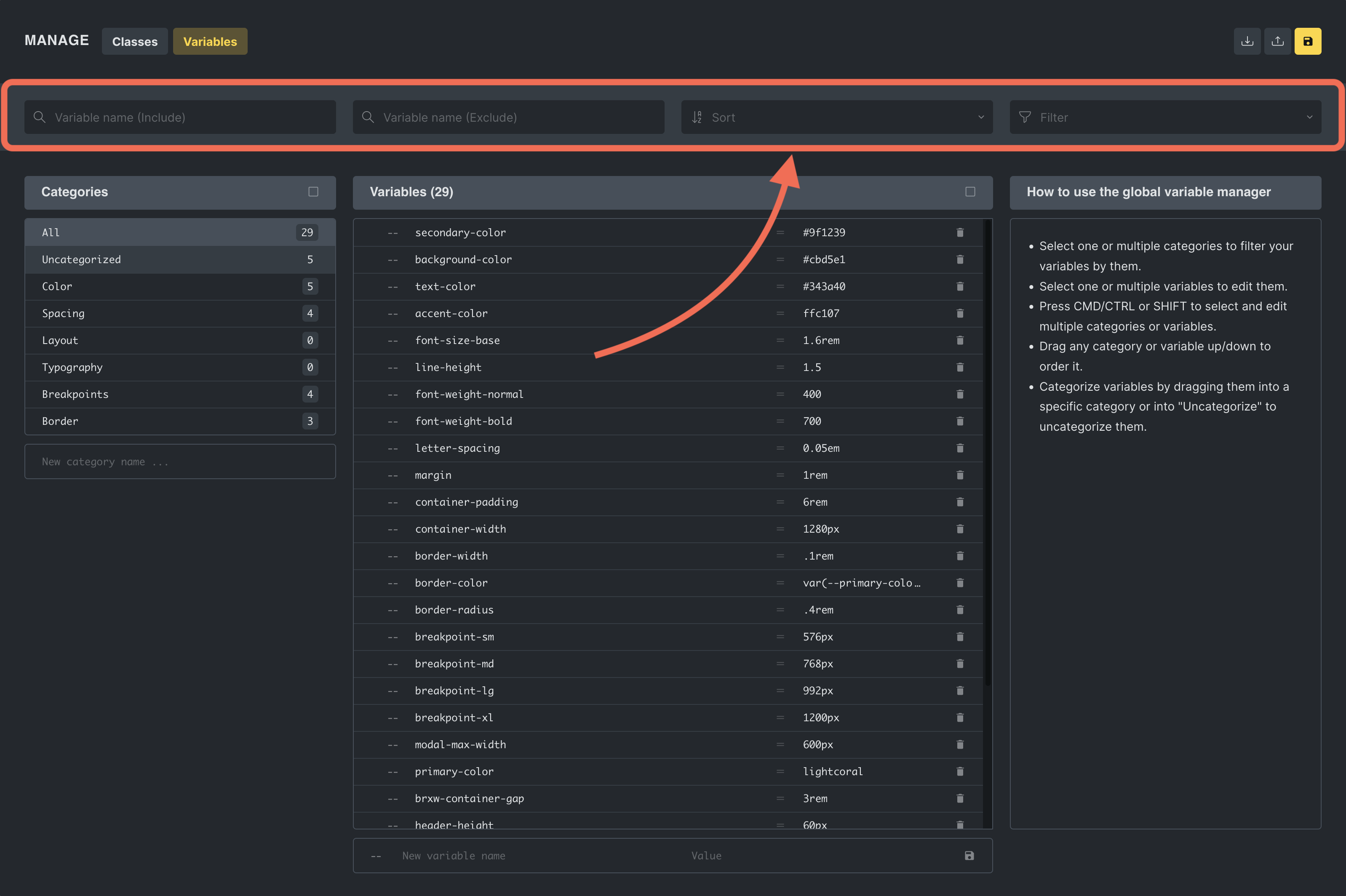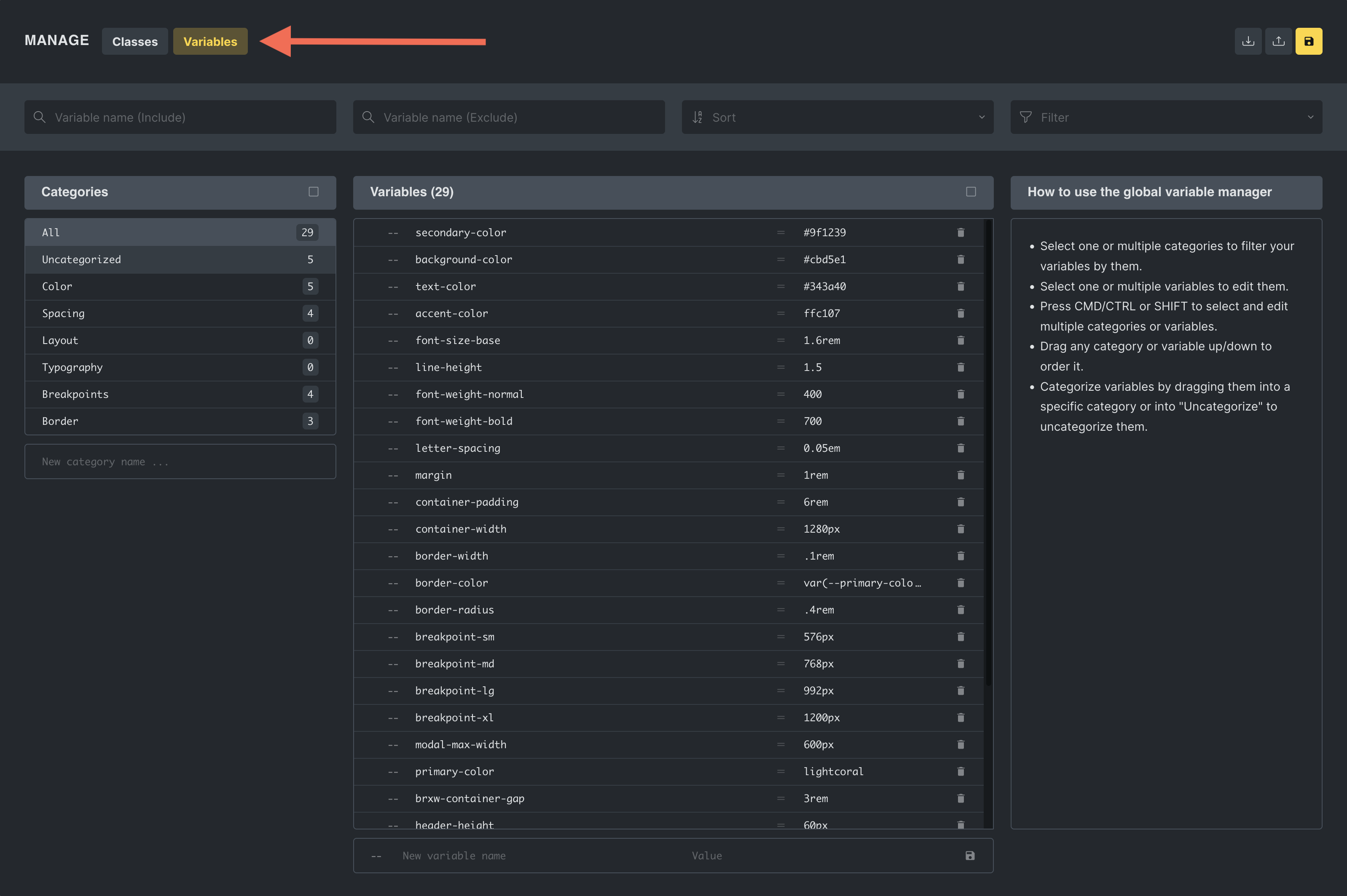 Section titled “Variable creation and management”In the Global Variables Manager, users can seamlessly handle CSS variables through a unified interface where they can: