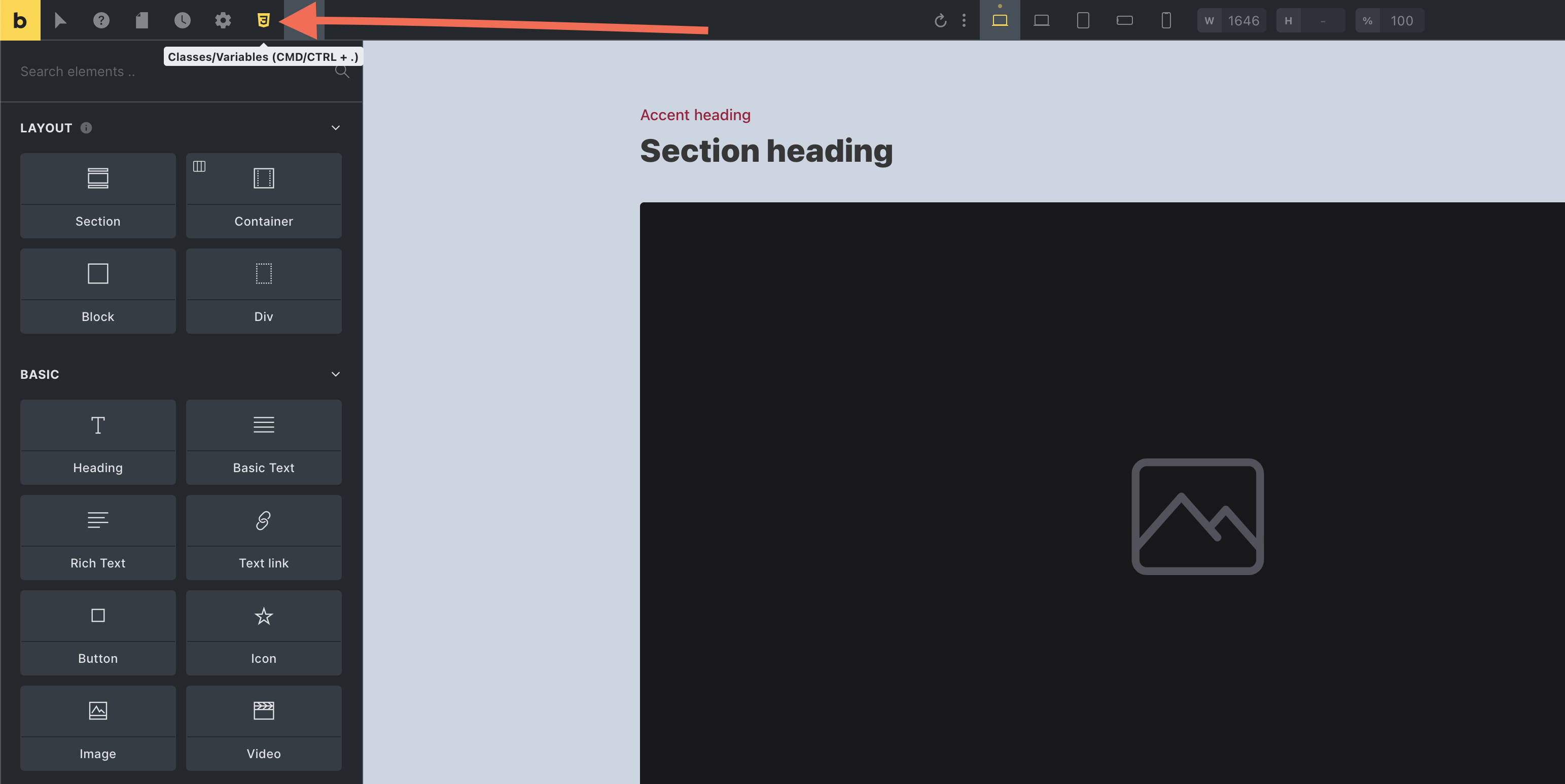 Section titled “Accessing the variables manager”The Global Class Manager is easily accessible: click the “CSS3” icon in the builder toolbar or use the CMD/CTRL + . keyboard shortcut to open the manager.