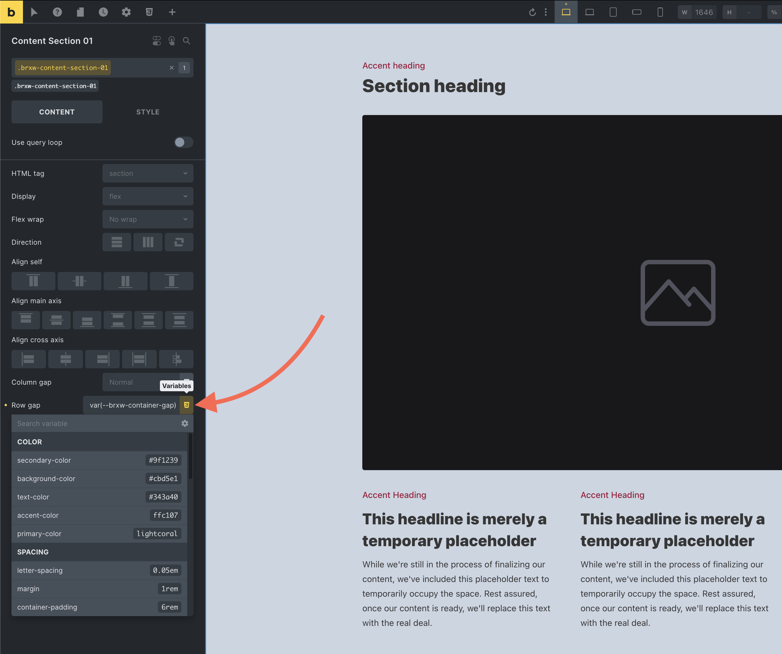 Clicking on a variable from the picker inserts it directly into the selected setting. Simplifying using consistent styles across different elements and classes of your website.