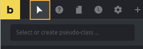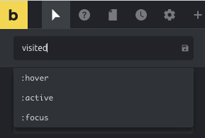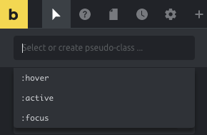 Section titled “Edit styles for element states or parts”Click the “cursor” icon in the builder toolbar to open the pseudo-class menu. Another click inside the text input reveals all available pseudo-classes & -elements. Select the one you want to edit.
