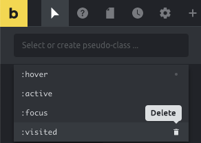 To do so, open the pseudo-class menu, reveal the dropdown, hover with your mouse over the pseudo keyword you want to delete. Then click the “bin” icon.
