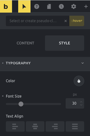 :hover .text--blueand hit return or click the Save (floppy) icon. - With the Div element still as the current element that is selected, go to STYLE → TYPOGRAPHY, click the Color control’s circle and set your desired color.