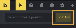 The “active” pseudo keyword will now show highlighted in the right corner. The toolbar “cursor” will appear highlighted as well, indicating you’re now editing the styles for a pseudo-class or pseudo-element: