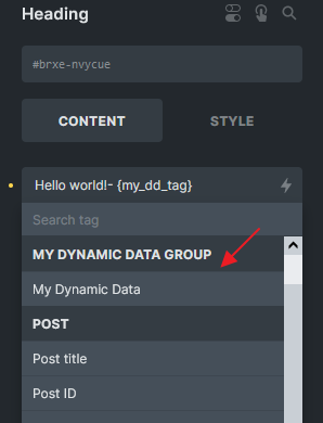 Section titled “Step 1: Register a tag through filter: bricks/dynamic_tags_list”Use the bricks/dynamic_tags_list filter to render your custom dynamic data tag in the builder.