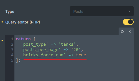 return $force_run;}, 10, 2 );Since 1.9.2, you can define $query_vars['bricks_force_run'] = true to achieve the same result as well. This will be handy if you are using the Bricks Query Editor or PHP filters like bricks/posts/query_vars etc.