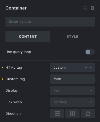 To complete this component, you have to wrap the products loop inside a form tag in order to use the product quantity input fields. To do that, wrap the container loop inside of another container (or div, or block) and set the HTML tag to custom and then insert form in the Custom tag input field.