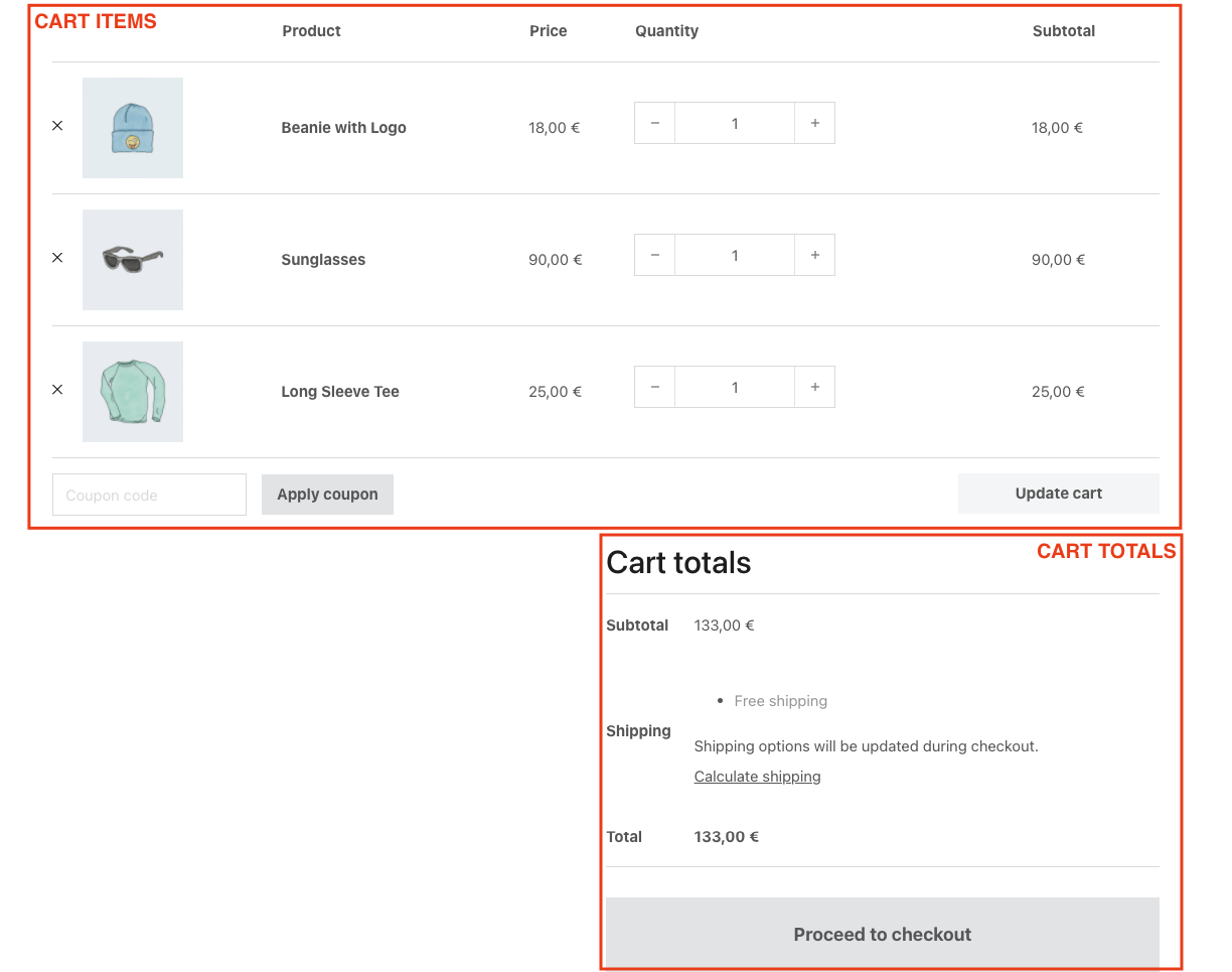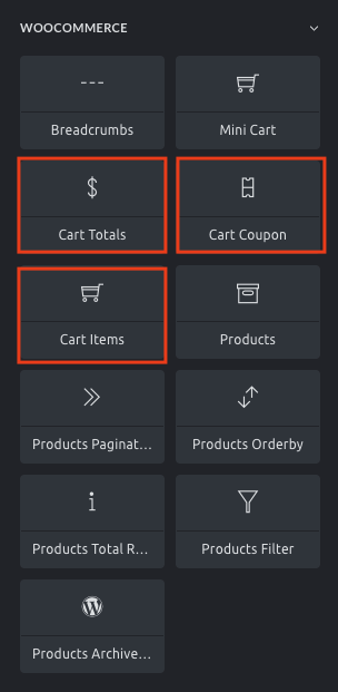 Section titled “Cart items”Render the cart contents table. With this element, you’ll be able to hide different parts of the table, style the table elements and the buttons, and hide the coupon input (so you could set it separately using the Cart Coupon element). For custom layout, check the section down below Cart contents loop.