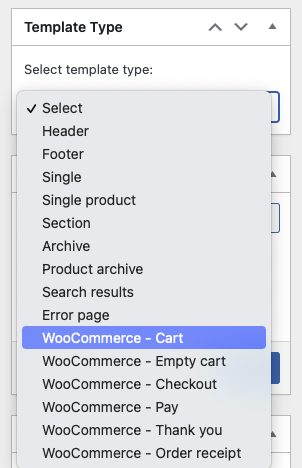 The “Cart” and “Empty Cart” template types are only visible if you have the WooCommerce plugin installed and active. These templates are used inside the WooCommerce Cart shortcode logic and they do not support template conditions (they are automatically rendered on the correct page).