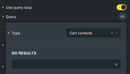 Section titled “Cart contents loop”Bricks 1.4. introduces a new query loop type, the Cart Contents. This query loops through all the products in the cart thus enabling the usage of the Dynamic Data tags to get the product name (post title), the product image (featured image), and the product-related tags like the product price, description, SKU and so on. This query loop is just for the Cart page.