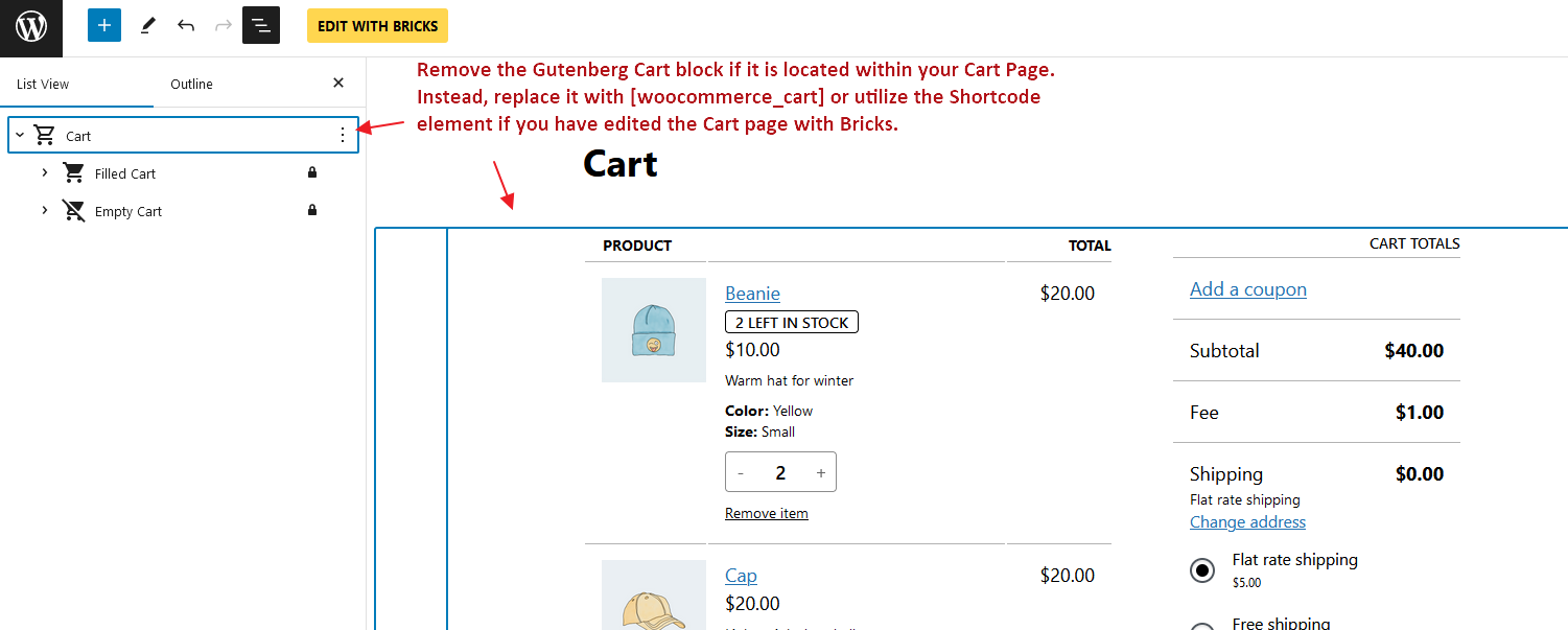 Section titled “Build your own cart items element inside the cart page”By default, the list of products inside the cart appears displayed on a table layout. This happens in the default WooCommerce cart template or when using the Bricks Cart Items element.