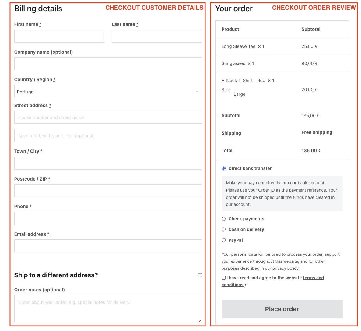 Section titled “Checkout template”The default checkout page consists of a two-columns layout: one column with the billing and shipping details form and another one with the order summary + a button to proceed with the order.
