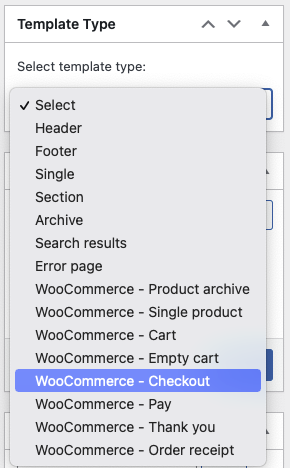 The “WooCommerce - Checkout”, “WooCommerce - Pay”, “WooCommerce - Thank you”, and “WooCommerce - Order receipt” template types are only visible if you have the WooCommerce plugin installed and active. These templates are used inside the WooCommerce checkout shortcode logic and they do not support template conditions (they are automatically rendered on the correct page).