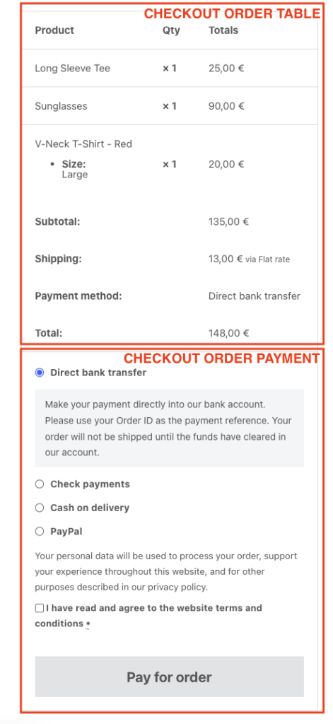 Section titled “Checkout order review”The checkout order review element renders the order summary, the available payment methods, and the button to place the order. Using this element, you’ll be able to style its different parts.