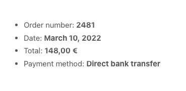 Section titled “Order receipt”For the situation where the visitor gets a link to the unpaid order receipt, the checkout workflow triggers the checkout/order-receipt.php template, which by default will look like this: