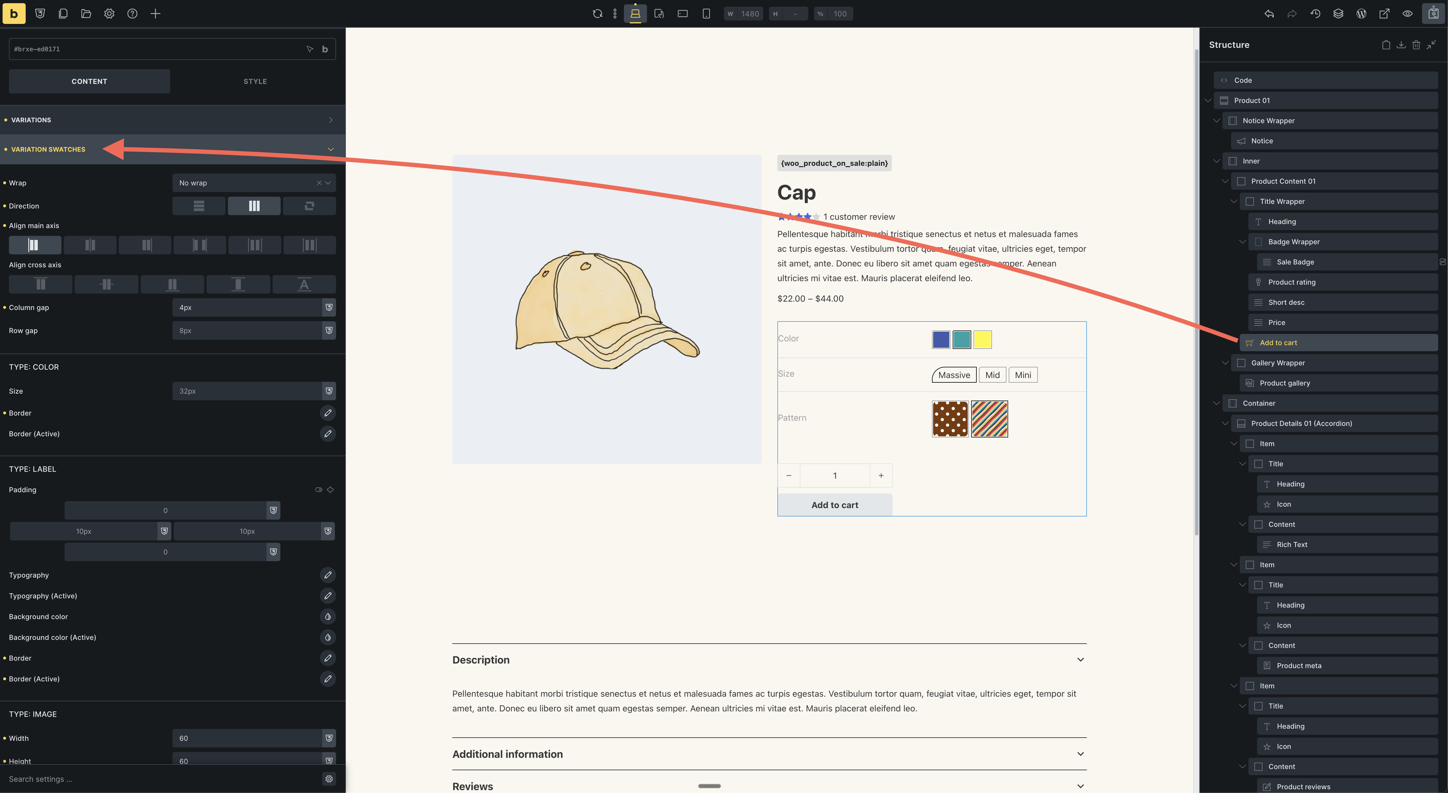 This feature integrates directly into the Add to cart element, letting you style variation swatches exactly how you want, without the need for extra plugins.