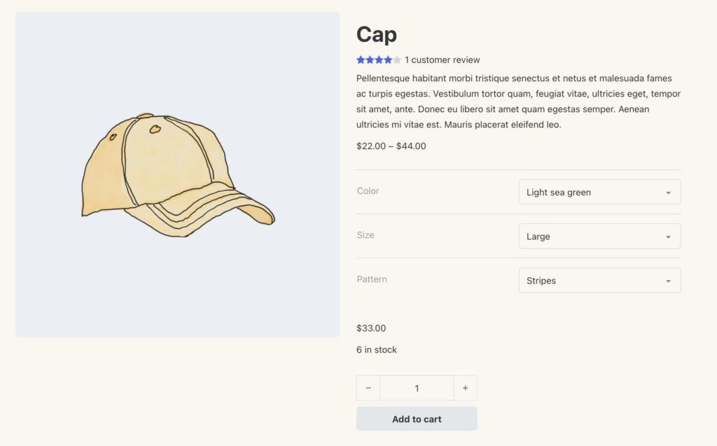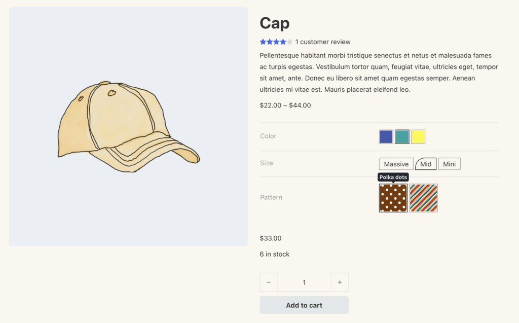 Section titled “Style swatches in the Add to cart element”Variation swatches are rendered inside the Add to cart element, as long as your product uses attributes with a swatch type.