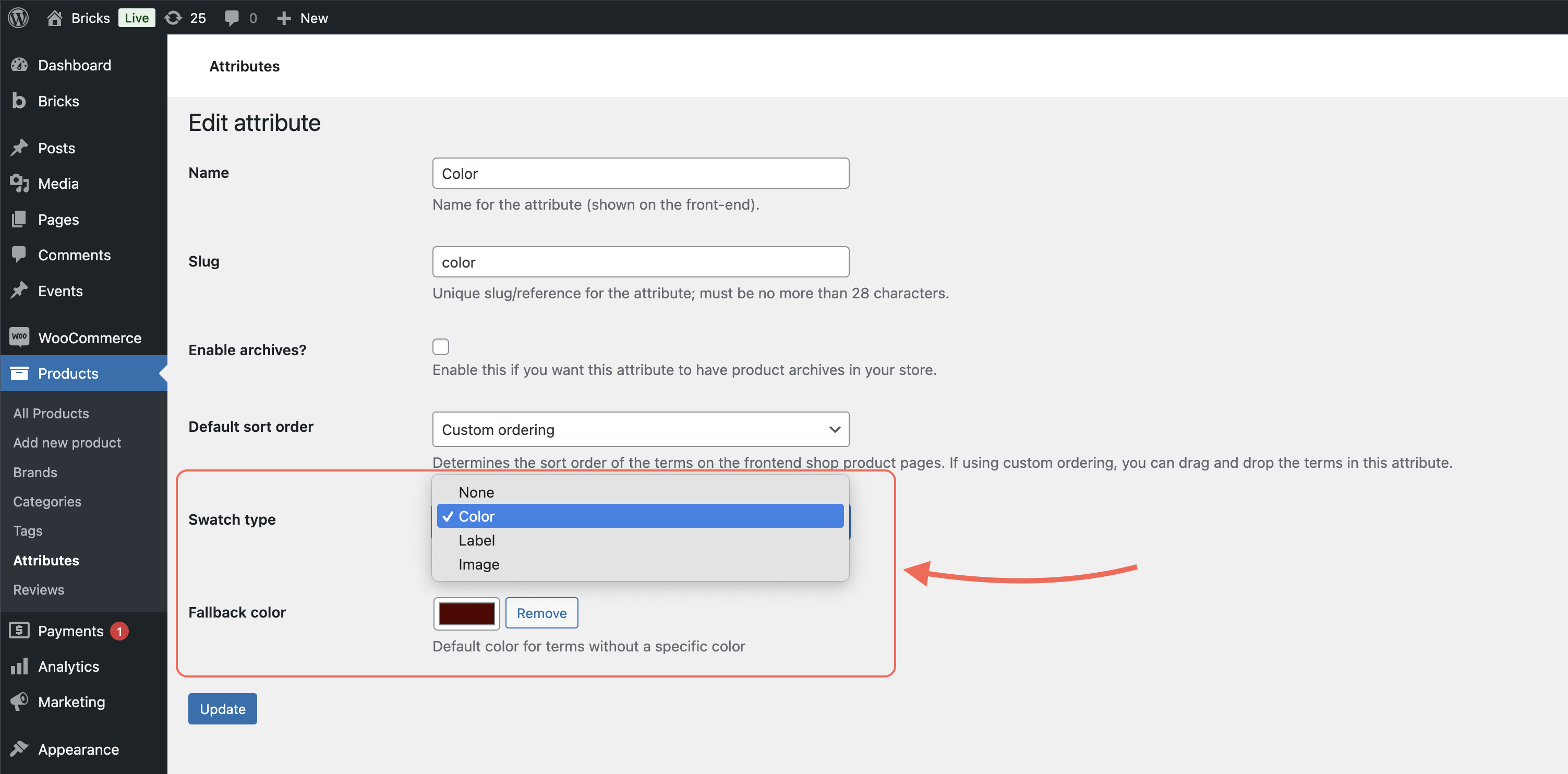 Section titled “Set a fallback value (optional)”While editing the attribute, you can also set a Fallback value. This fallback will be used if a specific term doesn’t have its own swatch value.