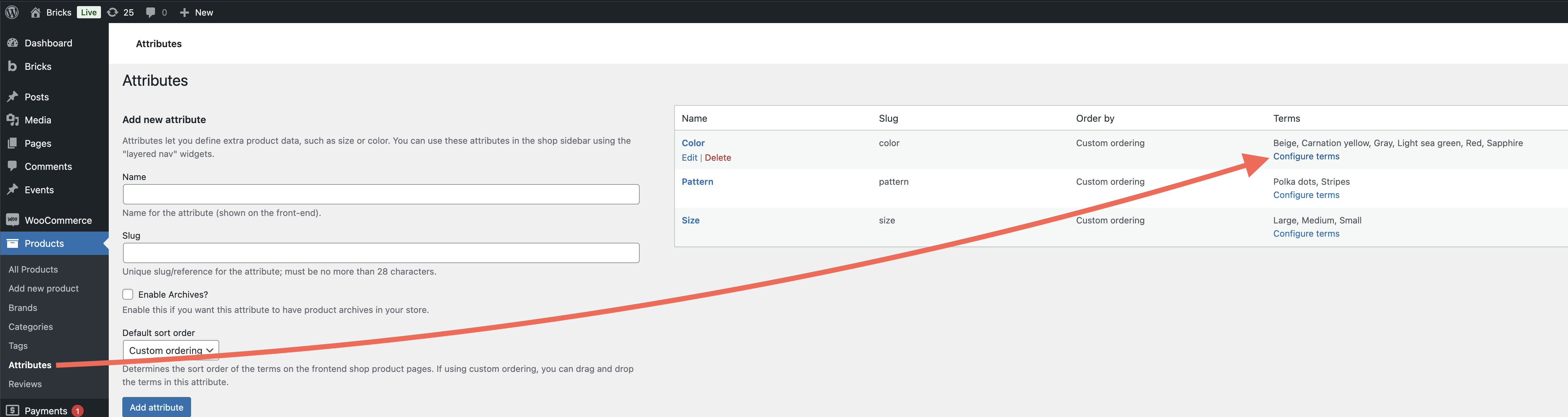Section titled “Assign swatch values to individual terms”Next, click Configure terms for the attribute you just edited.