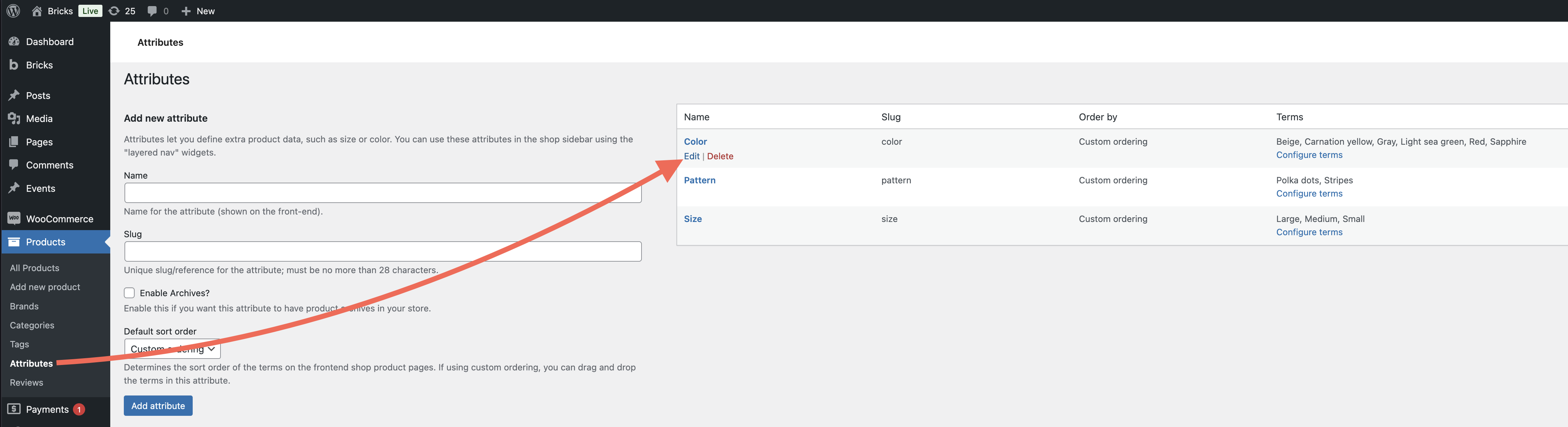 Section titled “Assign a swatch type to product attributes”Go to Products > Attributes, and click “Edit” on an existing attribute (or create a new one).