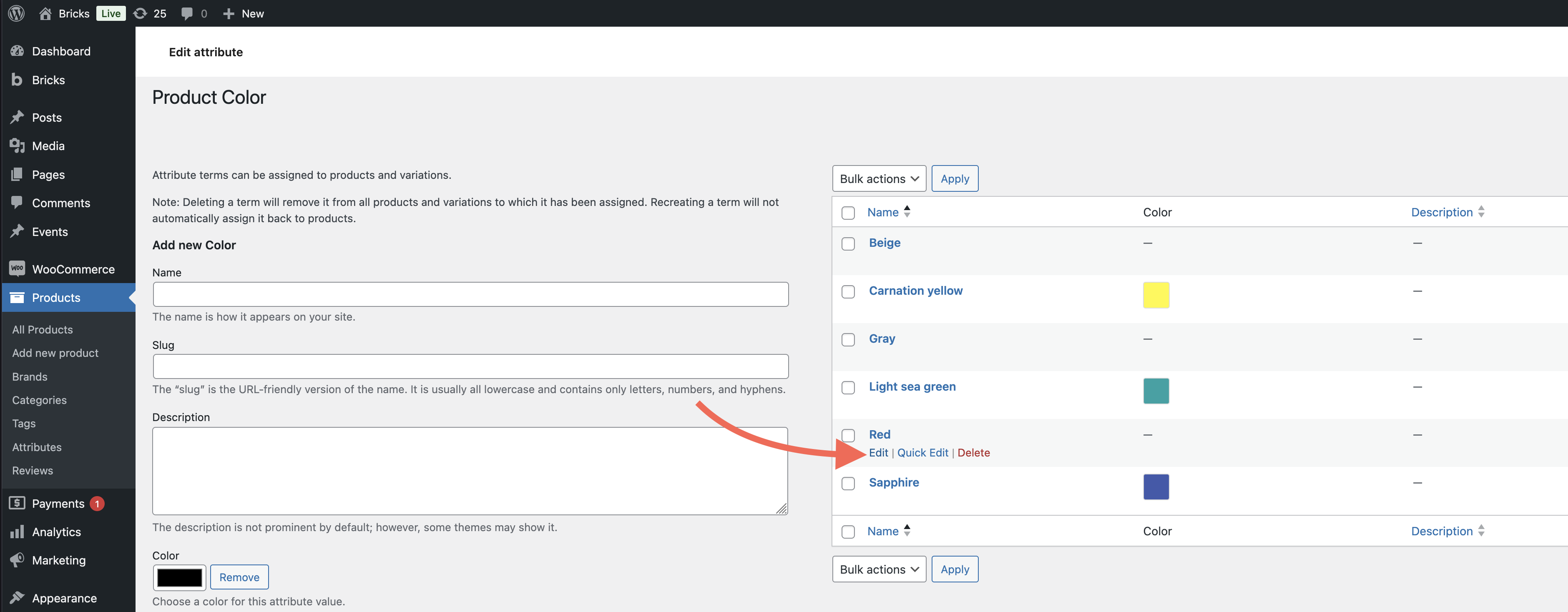 Then, click Edit on a specific term (like “Red” or “Large”).