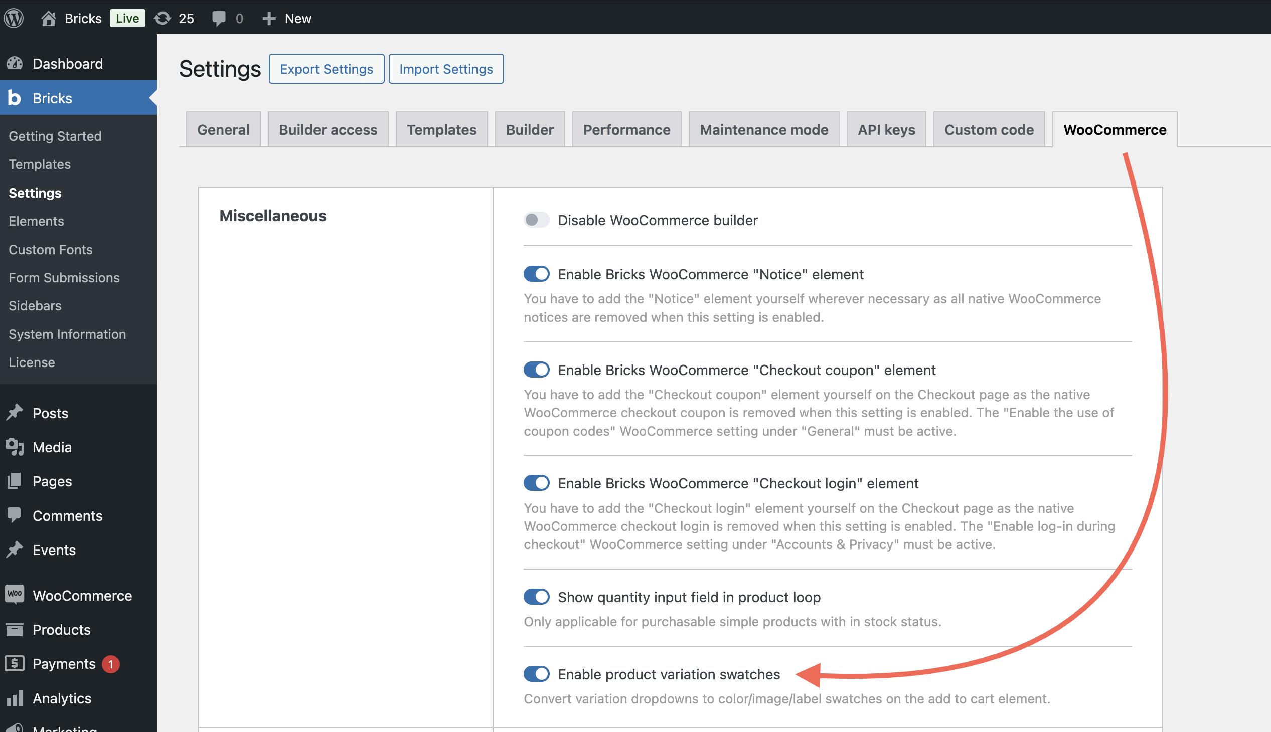 Section titled “Enable product variation swatches”To get started, go to Bricks > Settings > WooCommerce > Enable product variation swatches.