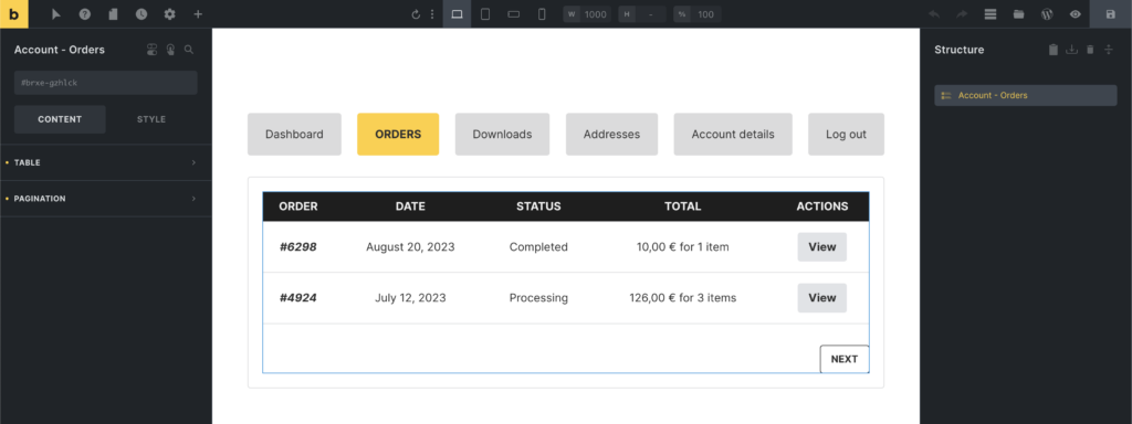 In the example below, we created a “WooCommerce - Account - Orders” template, to which we then added the “Account - Orders” that we styled a bit.