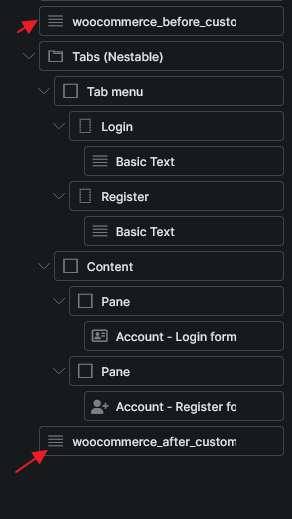 IMPORTANT: Ensure you have inserted a Basic Text element with {do_action:woocommerce_before_customer_login_form} before your Login and Register form. And another Basic Text element with {do_action:woocommerce_after_customer_login_form} after the forms.