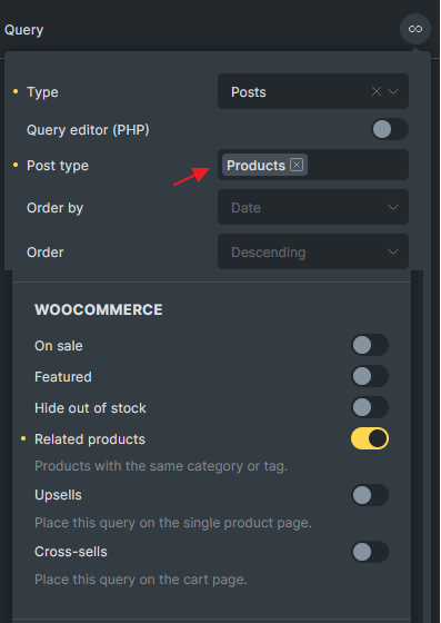 You can use these checkboxes under WooCommerce section to easily retrieve WooCommerce products. Please select the “Products” post type; otherwise, the WooCommerce section will be hidden. (@since 1.10)