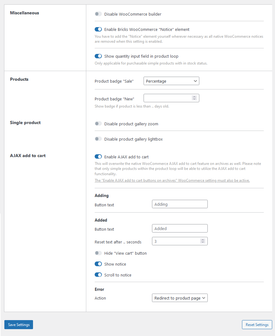 Disable WooCommerce Builder - This toggle disables the Bricks’ WooCommerce integration.